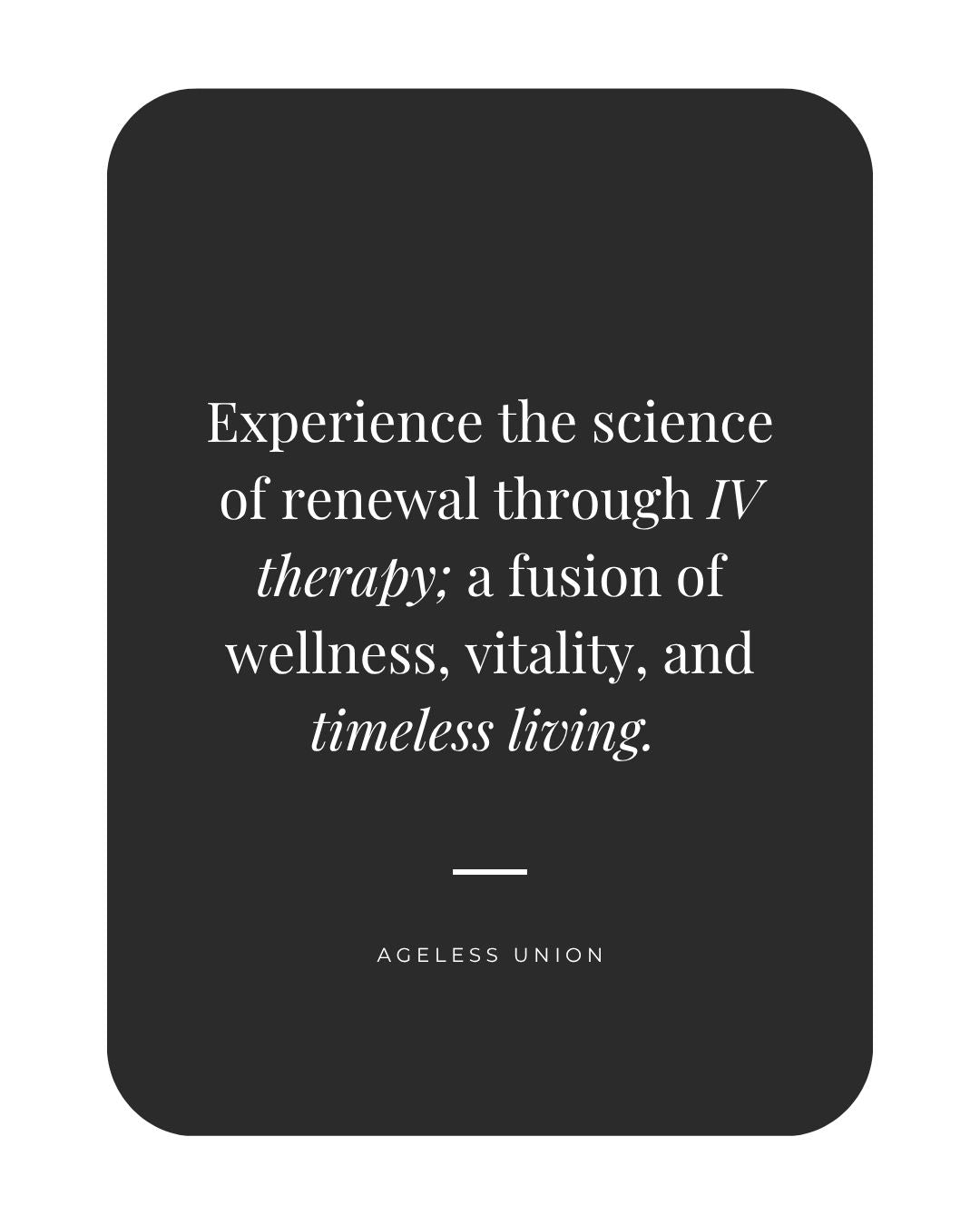 At Ageless Union, we analyze your body’s needs and recommend the IV therapies that will benefit you most. Whether your goal is hydration, energy, immunity, or overall wellness, we create a personalized plan so every infusion is effective, targeted, and tailored just for you.